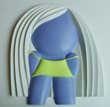 Selected by the curator, the Doll sculpture in purple resin with long and undulating white hair wears a yellow dress slightly showing her shoulders. She is half woman half girl and a disenchanted icon of femininity.