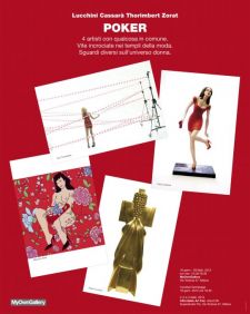 Dal 18 gennaio in MyOwnGallery la colletiva POKER sublima le opere di quattro artisti diversissimi fra loro: Flavio Lucchini, Paolo Cassara', Toni Thorimbert, Maurizio Zorat. Quello che li unisce e' un atteggiamento elegante, una sottile ironia, una visione neo-pop, una disincatata naturalezza, sia che si cimentino in opere monumentali o scultiurine, illustrazioni digitali o foto d'autore.