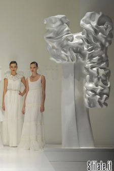 Flavio Lucchini, imponenti sculture di resina bianca madreperlata che rappresentano abiti divinizzati, sembrano riprodurre otticamente le ruches, i volants e le plissettature degli abiti da bambola della stilista. Un connubio riuscito dove la scultura dialoga profondamente con gli abiti, anch'essi vere opere d'arte.